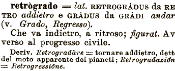 e GRÀDUS da GRADI andar (v. Grado, Regresso), Che va indietro, a ritroso; figurai. Av verso al progresso civile. Deriv. Retrogradare •==- tornare addietro, dett del moto apparente retrògrado === lat. RETROGRADI!» da RÈ TRO addietro dei pianeti ; Retrogradasi^ •==: Retrogressióne.