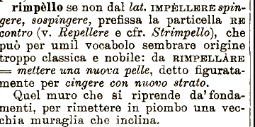 IMPÈLLERE spingere, sospingere, prefissa la particella RÈ contro (v. Repellere e cfr. detto figuratamente per cingere con nuovo strato. Quel maro che si riprende da'fondamenti, per rimettere in piombo rimpèllo se non dal lat. Strimpello), che può per umil vocabolo sembrare origine troppo classica e nobile: da RIMPELLÀRE == mettere una nuova pelle, una vecchia muraglia che inclina.