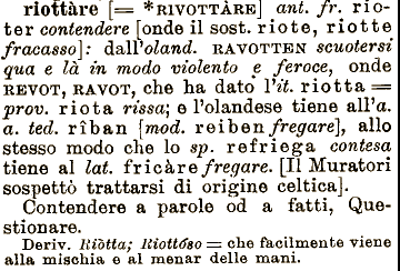 e Polandese tiene Riottoso alPa. a. ted. rėban [mod. r e i ben fregare}, allo stesso modo che lo sp. refriega contesa tiene al lat. fricāre fregare. [Il Muratori sospettō trattarsi di origine celtica]. Contendere a parole od a fatti, Questionare. Deriv. Riotta; il sost. riote, riotte fracasso]: āoėVoland. RAVOTTEN scuoterai qua e lā in modo violento e feroce, onde REVOT, RAVOT, rioftāre [= *RIVOTTĀREJ ani. fr. rioter contendere [onde che ha dato Vii. r i otta == prov. riota rissa, == che facilmente viene alla mischia e al menar delle mani.