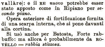 Forte rabbuffo: v aliare]: e il RÈ nuovo, potrebbe esser stato apposto come in Bipiano per secondo piano. Opera esteriore di fortificazione fornita di una scarpa interna, che si pone davanti alla cortina. Si usò anche per Batosta, ma allora è probabilmente da KOVÈLLO == rabbia stizzosa.