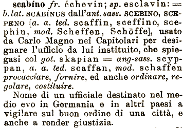 sass. SCEBINO, SCKPENO [a. a. ted. scaffin, sceffino, scephin, mod. Scheffen, ==== ang-sass, scyppan, a. a. ted. scaffan, mod. schaffen procacciare^ fornire^ ed anche ordinare, regolare^ scabino fr. échevin; ap. esclavin: == b. lai. SCABINUS dall'area Schóffe], usato da Carlo Magno costituire. Nome di un ufficiale destinato nel medio evo in Germania e in altri paesi a vigilare sul buon ordine di nei Capitolari per designare l'ufficio da lui instituito, che spiegasi col got. skapian una città, e anche a render giustizia.