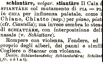 in GHIA per influenza palatale, come i Ghiano, Chiatto (nap.) per piano, piati (cfr. Ciantella)', ma invece sembra con interposizione dell nasale (v. Schiattare). Rompere con violenza, Fendere^ ed proprio degli alberi, dei panni e simili Cogliere o Staccar con violenza. Deriv. Schiantaménto; SchiantatUra; Schiànt schiantare, volgar, stiantare II Caix d SPIANTARE col mutamento di PIA === PL lo stess di SCHIATTARE, (fr. oélat).