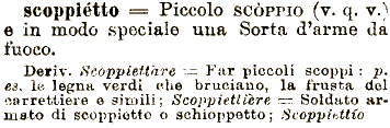 del carrettiere scoppietto === Piccolo SCÒPPIO (v. q. v.) e in modo speciale una Sorta (Tarme da fuoco. Deriv. Scoppiettare ^= Far piccoli scoppi : p. es. le legna verdi che bruciano, la frusta e simili; Scopplettière -=. Soldato armato di scoppietto o schioppetto; Scoppiettio