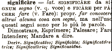 GNUM segno (v. q. voce) e FICĄRE per FA CERE fare (v. Fare): segni sono per lo pił le propr. far conoscer^ altrui alcuna cosa con seguir ma nelPus( questi significare === lat. SIGNIFICARE da si parole. Dimostrare, Esprimere; Palesare; Fan intendere; Mandare a dire. Deriv. Significativo; Significato; Significatóre trice; Signrftcatbrio; Significazione.