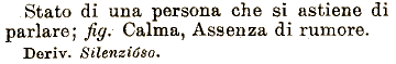 Stato di una persona che si astiene di parlare ', fìg. Calma, Assenza di rumore. Doriv. Silenzióso.