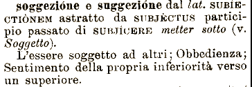 della propria inferiorità verso {soggezióne e soggezióne dal lai. SUBIECTIÒNEM astratto da SUBJKCTUS participio passato di SUBJKJERE metter sotto (v. Soggetto). L'essere soggetto ad altri; Obbedienza; Sentimento un superiore.