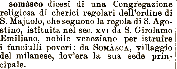 sec. xvi da S. Girolamo Emiliano, nobile veneziano, per istruire i fanciulli poveri: da SOMĀSCA, villaggio di una Congregazione , religiosa di cherici regolari delPordine di I S. Majuolo, somāsco dicesi che seguono la regola di S. Agostino, istituita nel del milanese, dov'era la sua sede prin-1 eipale. J