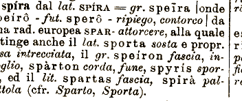 Ut. spartas fascia, spira palmola (cfr. spira dal lai. SPIRA == gr. speira (onde Ti )eiró -fui. spero - ripiego, contorco \ da la rad. europea SFAR- attorcere, inglio^ spàrton cordai/une, spyris spor, ed il alla quale tin^e anche il lai. sporta sosta e propr. sa intrecciata, il gr. speiron fascia^ Sparto, Sporta).