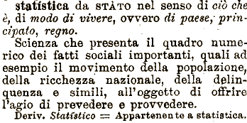 di vivere^ ovvero di paese, principato, regno. Scienza che presenta il quadro numerico dei fatti sociali importanti, quali ad esempio il movimento della popolazione, della ricchezza nazionale, della delinquenza e simile all'oggetto di offrire Fagio di prevedere statistica da STATO nel senso di ciò che èf di modo e provvedere. Deriv. Statistico == Appartenente a statistica.