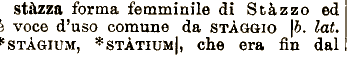 comune da STĀGGIO \h. lai. "STA CIUM, *STĀTIUM|, stazza forma femminile di Stazzo ed 1 voce d'uso che era fėn dal