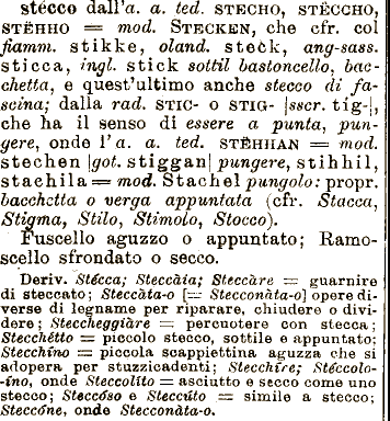 == sticca, f'ngl. stick soffii bastoncello, bacchetta^ e quest'ultimo anche stecco di fascina; dalia rad. STIC- o o appuntato; Ramoscello sfrondato o secco. Deriv. Stécca; Steccàia; Steccare, per riparare, chiudere o dividere ; Stoccheggiare =- percuotere con stecca ; Stecchétto STIG- \sscr. tig-[, che ha il senso di essere a punta^ pungere^ onde Fa. stecco, sottile e appuntato; Stecchino == piccola scappiettina aguzza che si adopera per stuzzicadenti; Stecchire; Stéccolo-ino, onde Steccolito = asciutto a. ted. STÈHHAM == mod. stechen \got. sfciggan[ pungere^ stihhil, staehila === mod. Stachel pungolo: propr. bacchetta o verga appuntata (cfr. Stacca, Stigma, Stilo^ Stimolo^ Stocco). Fuscello aguzzo piccolo == guarnire di steccato; Steccàta-o [-=-- Stecconàta-o] opere diverse di legname stécco dalFa. a. ted. STECHO, STKCCHO, STÈHHO == mod. STECKEN, che cfr. col fiamm. stikke, oland. steck, ang-sass. e secco come uno stecco; Stuccóso e Steccato .==. simile a stecco; Steccane, onde Stecconàta'o.