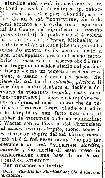 TWRDD strepito, tuono, come il r. ótonner stupire dal lat. tònus tuono. Però vi è il ted. BE-STÙRZEN |che può dial. sard. isturdire: a. fr. e stordir, mod. étourdir; a. sp. e storiir, mod. sp. cai. e pori. atordir, a furii r: da un b. lat. ^'EXTURDIRE, che è da porsi accanto a & stordàtus » registrato nel senso meta[brico di sciocco : e si osserva che i Francesi traggono una idea simile dal piccione 3 dicono « c'est un pigeon » === è un minchione^ e usano « dupe Il Diez dopo molto titubare si decide a de'ivarlo da TÒRPIDUS torpido^ onde ^ BX-TORPIDÀRE |== class. ex-torpèscerej1, lento, tal Du Cange nel significato di stordito \prov. storditi: la quale voce si è voluta ia taluni (Salvinì, Forster, Michaelis) ad.icnteli^re al lat. TÙRDUS |che spiegherebbe xnche 1*0 stretta) tordo, uccello facile a l'arsi accalappiare, preso stordire, onfondere, che merita di esser preso in .onsiderazione ^X-TORP'DÌRE, al modo istesso che da tè3Ìdus i Francesi fecero tiede e ti odi r )da tòrpidus » per gonzo, che1 7Ìene dal ted. taube colomba^ piccione. contro l'avviso del Thurneisen [al cimbr. han fatto tourdir; ili xróber da TÙRBIDUS onde EX-TURBIDIRK; | 1 Wacter far )resumere un ani. *STURTIAN| stordire come base di un b. lat. .TORDÀRE, STORDIRE. Far rimanere sbalordito. Deriv. Storditello; Stordiménto; Storditàggine; 'tordit^sa.