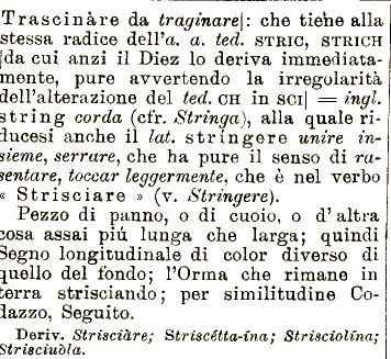 di rasentare, toccar leggermente^ che è nel verbo « Strisciare » (v. Stringere}. Pezzo di panno, o di cuoio, alla quale riiucesi anche Segno longitudinale di color diverso di quello del fondo; il lat. stringere unire insterne^ serrare^ che ha pure il senso o d' altra sosa assai più lunga che larga; quindi Trascinare da traginare\: che tiene alla stessa radice dell'a. a. ted. STRIO, STRICH [da cui anzi il Diez lo deriva immediatamente, pure avvertendo la irregolarità dell'alterazione del ted. CH in soi| == ingl. string corda (cfr. Stringa)^ l'Orma che rimane in berrà strisciando ; per similitudine Coiazzo, Seguito. Deriv. Strisciare; Striscétta-ina ; StriscioUna; \ Striscinola.