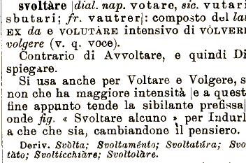 a che che sia, cambiandone 11 pensiero. Deriv. SvbHa; Svoltaménto; Svoltatura; Svc tato; Svolticchiāre; svoltare che ha maggiore intensitā [e a quesi fine appunto tende la sibilante prefissa onde fig. Ģ Svoltare alcuno per Indur \dial.nap. votare, sic. vaiar sbutari; fr. vautrerj: composto del la EX da e VOLUTĀRE intensivo di VŌLVER volgere (v. q. voce). Contrario di Avvoltare, e quindi D spiegare. Si usa anche per Voltare e Volgere, s non Svoltolare.