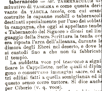 senso corre tuttora. Si dice anch per Ciborio l'arca dell'alleanza, durante L dimora degli Ebrei nel deserto, e dove lf si custodi fino non fu fabbricate il tempio. La suddetta voce poi trascorse a signi ficare le Cappelletto, tabernącolo == iat. TABERNACULUM aiminutivo di TABČRNA e come questa derivante da TĄBULA tavola^ con cui orane costruito le capanne mobili o tabernacoli destinati specialmente per l'uso dei soldati in campagna, che oggi si appellano tende « Tabernacolo del Signore » dicesi nel linguaggio della Sacra Scrittura la tenda ov era riposta a che nelle quali si dipin gono o conservano immagini sacre, od al fri edifizģ fatti a quella somiglianzą ed il questo (v. q. voce).