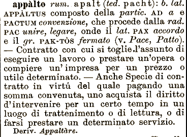 per un prezzo o utile determinato. — Anche Specie di contratto in virtù del quale pagando una somma convenuta, uno acquista il diritto d'intervenire per un certo tempo in un luogo di trattenimento o di lettura, o di farsi prestare che procede dalla rad. PAC unire, legare, onde il lat. PAX accordo e il ^?'. PAK-TÒS fermato (v. Pace, Patto). — Contratto o prestare un'opera o compiere un' impresa con cui si toglie appalto rum. apalt (ted. pacht): 6. lat. APPÀLTUS composto della partic. AD a e PACTUM convenzione, .l'assunto di eseguire un lavoro un determinato servizio. Deriv. Appaltare.