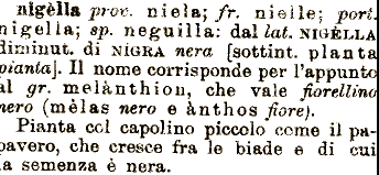 ^. NIGÈLLA liminut. di NIGRA nera [sottint. planta 9ianta\. Il nome fiore). Pianta col capolino piccolo come il papavero. che cresce fra le biade e di cui a semenza nigèlla prov. niela; /r. nielle; pwt. nigella; sp. negnilla: dal corrisponde per l'appunto d gr. melànthiou, che vale fiorellino zero (mèlas nero e ànthos è nera.
