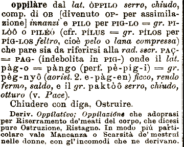 in PIO-) onde il lai. pàg-o === pàngo (perf; pè-pig-i) = gr. pèg-nyó (aorist. 2. e-pàg-en)^cco, rendo fermo, saldo, e il gr. paktòò serro, Deriv. Oppilativo; Oppilaaidne che adoprasi per Biserramento delineati del oorpo, che dicesi pure Ostruzione, Ristagno. oppilàre dal lai, ÒPPILO serro, chiudo, comp. di OB [divenuto OP- per assimilazione] innanzi e PILO per PIO-LO == gr. PILÒÓ chiudo, otturo (v. Pace). Chiudere con diga, Ostruire. o PILÉÓ (cfr. PÌLUS === gr. PILOS per PIO-LOS feltro, cioè pelo o lana compressa) che pare sia da riferirsi alla rad, sscr. PAC=== PAd- (indebolita In modu più particolare vale Mancanza o Scarsità de* mestrui nelle donne, con gP incomodi che- ne derivano.