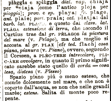 (v. Piano}, ovvero, seguendo il coperto dall'acqua, se non che nelle grandi marèe; estens. Salita nap, chiama per *piaja [come V antico ploja per pioggia}, prov. e sp. playa; /r. piago, ani. piale; pori, praia; cai plafcja: dal barb. [cfr ted. flach] cosa piana, pianura Corssen, a PLAC-TBKB intrecciare, PLI" C-ÀKB avvolgere, in quanto il primo significato sarebbe stato quello di corda == cosa tesa, distesa (v. Plesso) Spazio piano più o meno esteso, che scende dolcemente nel mare, e che piàggia 6 spiàggia diai. lai. PLAGIA e questo dal class. lai. PLAGA estensione di terra, che secondo il Curtius trae dal gr. PBLAOOS la piareura del mare (v. Pelago), ma che meglio si accosta al gr. PLAX non è di monte poco repente.