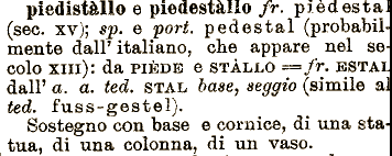 fr. pi č ci est a i (sec. xv); sp. e port. pedestal (probabilmente dal? italiano, che appare nel secolo xm): da cornice, di una statua, di una colonna, di un vaso. piedistallo e piedestāllo PIEDE e STALLO ===/r. ESTAL dal? a. a, ted. STAL base, seggio (simile ai ted. fnss-gestel). Sostegno con base e