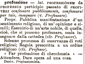 prescritta professióne == lai. PROFESSIÒNEM da PROFÈSSUS participio passato di PROFITÈRI confessare pubblicamente, confessarsi per tale, insegnare Professare). Propr. Pubblica manifestazione d'un sentimento religioso, di un5 opinione e simili; Esercizio di untarle nobile, di quelle, cioè, che si possono professare, ossia insegnare dalla cattedra a un ordine religioso (cfr. Professo). « Par professione di checchessia » Attendere, Dare opera (cfr. Professore). Solenne promessa di osservanza di voti religiosi; Regola (v. ad una cosa. Deriv. Professionista.