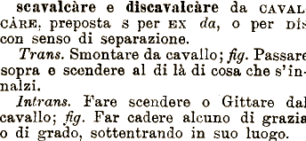 per EX da, o per DĖ;: con senso di separazione. Trans. Smontare da cavallo ; fig. Passar* sopra e scendere al di lā di cosa che s^in naizi. Intrans. scendere o G-ittare da cavallo; fig. Far cadere alcuno di grazis o di grado, sottentrando in suo luogo. scavalcare e discavalcāre da CAVAL CARE, preposta s Pare