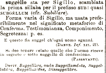 (DANTE. Inf. xix. 21). Si dee tenere celato quello che l'uomo riceve Segretezza: p. es. E questo fia suggel in segreto suggèllo sta per Sigillo, scambiata la prima sillaba per il prefisso SUB: quasi SUBGÈLLUM (cfr. Subillare). Forma varia di Sigillo, ma usata preferibilmente nel significato metaforico di Conferma, Testimonianza, Componimento, e sotto suggello di confessione. ch'ogni nomo sganni. (P.ASSAVANTI). Deriv. Suggellare, onde Suggellamento, Suggellettura, Suggellasene, Dissuggellare.