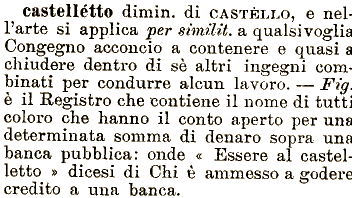 lavoro. — Fig, è il Registro che contiene il nome di tutti coloro che hanno il conto aperto di denaro sopra una banca pubblica: onde « Essere castellétto dimin. di CASTÈLLO, e nell'arte si applica per similit, a qualsi voglia Congegno acconcio a contenere e quasi a chiùdere dentro di sé altri ingegni combinati per condurre alcun per una determinata somma al castelletto » dicesi di Chi è ammesso a godere credito a una banca.
