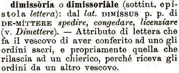 che rilascia ad un chierico, perché riceva gli ordini da Dimettere), — Attributo di lettera che fa il vescovo di aver conferito dimissòria o dimissoriàle (sottinfc. epistola lettera)', dal lai. DIMISSUS p. p. di DE-MITTERE spedire^ congedare^ licenziare (v. ad uno gli ordini sacri, e propriamente quella un altro vescovo.