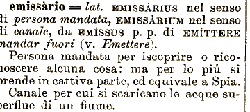 si )i*ende in cattiva parte, ed equivale a Spia. Canale per cui si scaricano emissārio == lai. EMISSĀRII; s nel senso li le acque su)erflue di un persona mandata, EMISSĀRITJM nel senso li canale, da EMISSUS p. p. di EMITTERB nandar fuori (v. Emettere}. Persona mandata per iscoprire o ricoloscere alcuna cosa: ina per lo pių fiume.