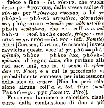 fuòco e fòco === lat. FÒC-US, che vuois detto pyr fuoco (v. Piro)}. Fenomeno per * FÒVICUS, dalla stessa radice *Fòav-EO riscaldo, e del gr phòg-ó=== phò-zó arrostisco, abbrustoli sco, phòg-anon utensile per abbrustolire phois scottatura, che cfr. col? a. a. ted b a h - u === mod. b a e h e cuocio, friggo : - rad BHAG d: FÒV-EO per luminoso e calorifico, risul == gr. PHÒO == lat. FOC - (cfr. Fomite) Altri [Corssen, Curtius, Grassman] invec( ravvicina questa voce'al gr. p h o ===p ha ( splendo, phòos == phàos luce, phòsk-c splendo, phèggos lume, che portano alle rad. sscr. BHA, che ha il senso di splen dere (v. Face), e a cui la precedente VE probabilmente connessa per intercessiom della idea di ardere. [Non ha però rela zione alcuna coli5 a. a. ted. fiur (mod Fauer)==^r. tante dalla combustione di due o pii