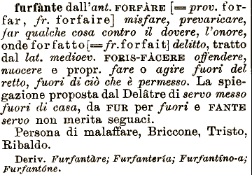 La spiegazione proposta prevaricare, far qualche cosa contro il dovere, Fonare, [===/r. furfante dall'ani. FORFĀRE [-==prov. forfar, fr. forfaire] misfare, onde forfatto forfai t] delitto, tratto dal lai. medioev. FO^IS-FĀCERE offendere, nuocere e propr. fare o agire fuori del retto, fuori di ciō che č permesso. dal Delātre di servo messo fuori di casa, da FUR per fuori e FANTE servo non merita seguaci. Persona di malaffare, Briccone, Tristo, Ribaldo. Deriv. Furfantare; Furfanterėa; Furfantfno-a; Furfantane.