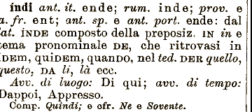 ani, it. ende; rum. inde; prov. e x./r. ent; ani. sp. e ani. port. INDE composto della preposi ende: dal at. indi z. IN in e ;ema pronominale DE, che ritrovasi in DBm, quiDEm, quanDO, nel ted. DER quello, (uestOf DA Hf lą ecc. Avv. di luogo: Di qui; avv. di tempo: Dappoi, Appresso. Gomp. (Quindi; e ofr. Ne e Sovente.