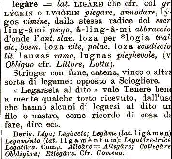 Iv gos minine, dalla stessa radice del sscr ling-àmi piego, à-ling-à-mi dall'use legare === lai. LIBARE che cfr. col gr\ LYGBIN o LYGÒEIN piegare, annodare, abbraccio d'onde Vani. slav. lo za per ^logia trai GÌO, boem. lo za vite, polac. i o za, scudiscio Tenere ben a mente qualche torto ricevuto, Ut. lauzas ramo, lugnas pieghevole, (v Obliquo cfr. Littore, Lotta). Stringer con fune, catena, vinco o altri sorta che hanno alcuni di legarsi al dito ui filo o nastro, come ricordo di cosa dì fare, dire ecc. Deriv. Léga; Legàccio; Legame {lai. ligàmen) Legaménto {lat. di legame: opposto a Sciogliere. « Legarsela al dito » vale ligamèntu m); Legatdre-trzce Legattira. Comp. Alleàre == Allegare; Oollegàr Obbligare; Rilegare. Cfr. Gomena.
