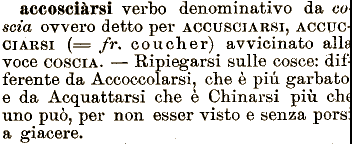sulle cosce: dif ferente da Accoccolarsi, accosciarsi verbo denominativo da e. scia ovvero detto per ACCUSCIARSI, ACCUC Ol ARSI (== fr, coucher) avvicinato alh voce COSCIA. — Ripiegarsi che è più garbato e da Acquattarsi che è Chinarsi più ch uno può, per non esser visto e senza pors a giacere.