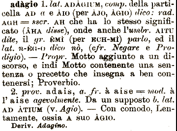 AITU dite, il ./?'. KMt (per F^CH-MÌ) parli), ed Motto aggiunto a un discorso, e indi Motto contenente una sentenza o precetto che insegna a ben contenersi; Proverbio. 2. pì'ov. adais^ a. fr. AD a e Àio (per ÀJO, ÀGIO) dico: rad. AUH === fsscr. AH che ha lo stesso significato (ÀHA dt^e\ onde anche Vwnbì'. il /a. n-K(^-o rf/c'^ no, (c/r. Negare e Prodigio).—Propr. a a i s e === mod. a P a i se agevolmente. Da un supposto ^. lai. AD adagio 1. lai. ADÀGIUM, comp. della particella ÀTIUM (v. Agio). — Con comodo, Lentamente, ossia A suo ÀGIO. Deriv. Adagino.