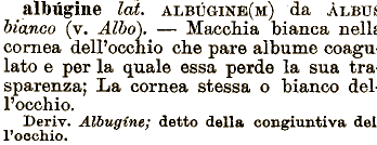 perde la sua tra sparenza; La cornea stessa o bianco del l'occhio. Deriv. Albugine; detto albugine lai. ALBŁGINE(M) da ALBI bianco (v. Albo). Macchia bianca nell cornea dell'occhio che pare albume coagu lato e per la quale essa della congiuntiva del Pocchio.