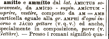 '.oprzrey vestire, composto amitto e ammitto dal lat. AMICTUS sopravveste, da AMÌCIO - supin. AMICTUM da AM ==== AMB )articella eguale alla gr. AMPHI d'ogni inorno e JÀCIO gettare (v. q. v.) ed anche, specialmente in composizione, porre (v. dettare). — Presso i romani significò qua