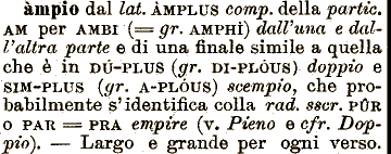 PUR o PAR == PRA empire e! SIM-PLUS (gr. A-PLĶUS) scempio, che probabilmente s'identifica colla rad. āmpio dal lat. ĀMPLUS comp. della partic. AM per AMBI (== gr. AMPHĖ) dalVuna e dalF altra parte e di una finale simile a quella che č in DU-PLUS (gr. DI-PLĶUS) doppio ssar. (v. Pieno e cfr. Doppio}. Largo e arando per ogni verso.