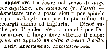 affine di recargli danno ed ingiuria. == Dicesi anAe per Prender PÓSTO; nonché per Determinare il luogo dove vibrare appostare Da PÓSTA nel senso di spiarlo 3 per parlargli, ma per lo più luogo ove aspettare, ove attendere (v. Posta).— Aspettare "uno a posto sicuro per il colpo: p. es. gli appostò un colpo a mezzo il collo. Deriv. Appostaménto^ Appo stato re-trice.