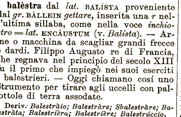 frecce (dardi. Filippo Augusto rè di Francia, .he baléstra dal lai. BALISTA proveniente lai regnava nel principio del secolo XIII u il primo che impiegò nei suoi eserciti balestrieri. gr. BALLEIN gettare, inserita una r nel'ultima sillaba, da scagliar grandi come nella voce incMo'tro == lat, ENCÀUSTUM (^.Balista). — Arno o macchina — Oggi chiamano cosi uno {frumento per tirare agli uccelli con palottole di terra assodate. Deriv.' Balestralo; Balestrare; Sbalestrare; Ba" ì8tràta; Balestriera; Balestrière! Balestruccio.