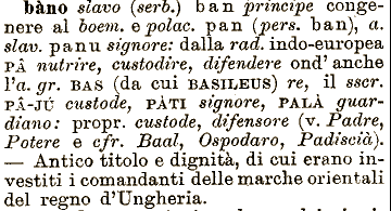 signore: dalla (da cui BASILEUS) rč, il sscr. PA-JŲ custode, PĀTI signore, PALA guardiano : propr. custode, difensore (v. Padre, Potere e c/r. Baal, ra^. indo-europea PĀ nutrire, custodire, difendere ond' anche Va. gr. BAS bālio slavo (serb,) ban principe congenere al boem. e polac. pan (pers. ban), a. slav, panu Ospodaro, Padisciā). Antico titolo e dignitā, di cui erano investiti i comandanti delle inarche orientali del regno d'Ungheria.