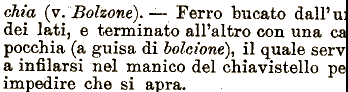 alPaltro con una ehia (^.Bolzone').—Ferro bucato dall'ut dei lati, e terminato ca pecchia (a guisa di bolcwne)^ il quale serv a infilarsi nel manico del chiavistello pe impedire che si apra.