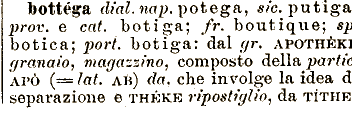 boutiqne; s^ bofcica; pori. botiga: bottéga dial. nap. poiega, sf'c. p u tiga prov. e caf. botiga; fr. dal gr. APOTHÈK: granaio, magazzino, composto della partn APÒ (=== !af. AB) da. che involge la idea d separazione e THÉKE ripostiglio, da TITHE