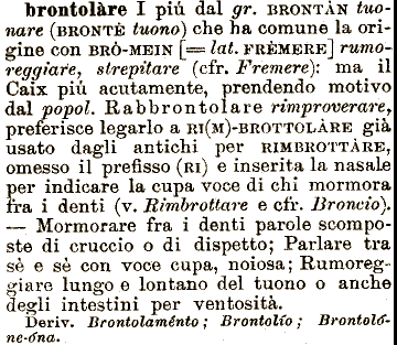 la origine con BRÒ-MEIN [^lat.FRÈMERE] ma il lungo e lontano del tuono o anche rumoreggiare, strepitare (cfr. Fremerei torontolàfe I più dal gr. BRONTÀN tuo' nare (BRONTÈ tuono) che ha comane Caix più acutamente, prendendo motivo dal popol. Rabbrontolare rimproverare^ preferisce legarlo a RI(M)-BROTTOLÀRE già usato dagli antichi per RIMBROTTARE, omesso il prefisso (Ri) e inserita la nasale per indicare la cupa voce di chi mormora fra i denti (v. Rimbrottare e cfr. Broncio}. —Mormorare fra i denti parole scomposte di cruccio o di dispetto; Parlare tra sé e sé con voce cupa, noiosa; Rumoreggiare degli intestini per ventosità. Deriv. Brontolct'niénto,' Brontolio,' Brontola' ne-ona.