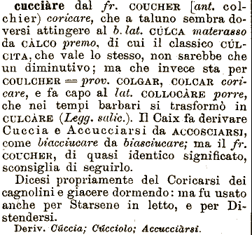 vale lo stesso, non sarebbe che un diminutivo; ma che invece sta per COULCHER == prov. COLGAR, COLOAR coricare, e fa capo al lat. COLLOCARE porre, che nei tempi barbari si trasformò in CULCÀRE (Legg, sah'c.). Il Oaix fa derivare Cuccia e A e cucciarsi da ACCOSCIARSI, come biacciucare premo, di cui il classico CÙLCITA; che da biasciucare; ma cucciare dal fr. COUCHER [ani. col- \ chier) coricare, che a taluno il fr. COUCHER, di quasi identico significato, sconsiglia di seguirlo. Dicesi propriamente del Coricarsi dei cagnolini e giacere dormendo: ma fu usato anche al &. Zcró. sembra do- i versi attingere CÙLCA materasso da CALCO per Starsene in letto, e per Distendersi. i Deriv. Cùccia; CUcciolo; Accucciàrsi.