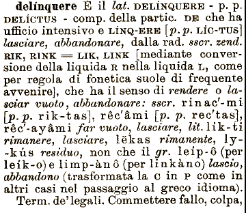 p. rec'tas^, rèc'-ayàmi far vuoto, lasciare, Ut. lik-ti rimanere, lasciare, lèkas rimanente, dalla rad. sscr. zend. RIK, RINK ==== LIK, LINK [mediante conversione della liquida R nella liquida L, come per regola di fonetica suole di frequente partic. che ha ufficio intensivo e LINQ-ERE [p'p- LIC-TUS] lasciare, abbandonare, DE vuoto, abbandonare : sscr. r ina e'-m i [jp.j?. rik-tas^, réc'àmi [p. avvenire], che ha il senso di rendere o lasciar delinqnere È il lat. DELINQUBRE - p. p. DELÌCTUS - comp. della ly-kùs residuo, non che il gr. leip-ò(per leik-o)e limp-ànò (per linkàno) lascio^ abbandono (trasformata la e in p come in altri casi nel passaggio al greco idioma). Terra, de'legali. Commettere fallo, colpa,