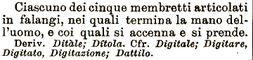 in falangi, nei quali termina la mano delPuomo, e coi quali si accenna e si prende. Deriv. Ditùie; Ditola. Cfr. Digitale; Digitare^ Digitato, Digitazione; Ciascuno dei cinque membretfci articolati Dattilo.