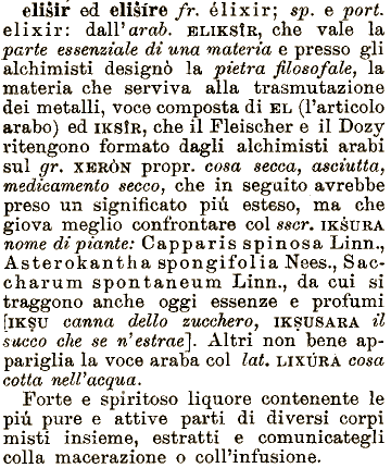 flKSU canna dello zucchero, IKSUSARA il succo che se n1 estrae}. Altri non bene appariglia la voce araba col lat, LIXÙRÀ cosa medicamento che vale la parte essenziale di una materia e presso gli alchimisti designò la pietra filosofale, la materia che serviva alla trasmutazione dei metalli, voce composta di EL (l'articolo cotta nell'acqua. Forte e spiritoso liquore contenente le più pure e attive parti di diversi arabo) ed IKSÌR, che il Fleischer e il Dozy ritengono formato dagli alchimisti arabi sul gr. XERÒN propr. cosa secca, asciutta, secco, che in seguito avrebbe preso un significato più esteso, ma che elisir ed elisire giova meglio confrontare col sscr. IKSTJRA nome di piante: Capparis spinosa Linn., Asterokantha spongifolia Nees., Saccharum spontaneum Linn., da cui si traggono anche oggi essenze e profumi corpi misti insieme, estratti e comunicategli colla fr. élixir; sp. e pori. elixir: dall'arac. ELIKSÌR, macerazione o colPinfusione.