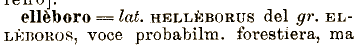tVlJL\J\. ellèboro = lat. HELLÈBORUS del gr. ELLÈBOROS, voce probabilm. forestiera, ma